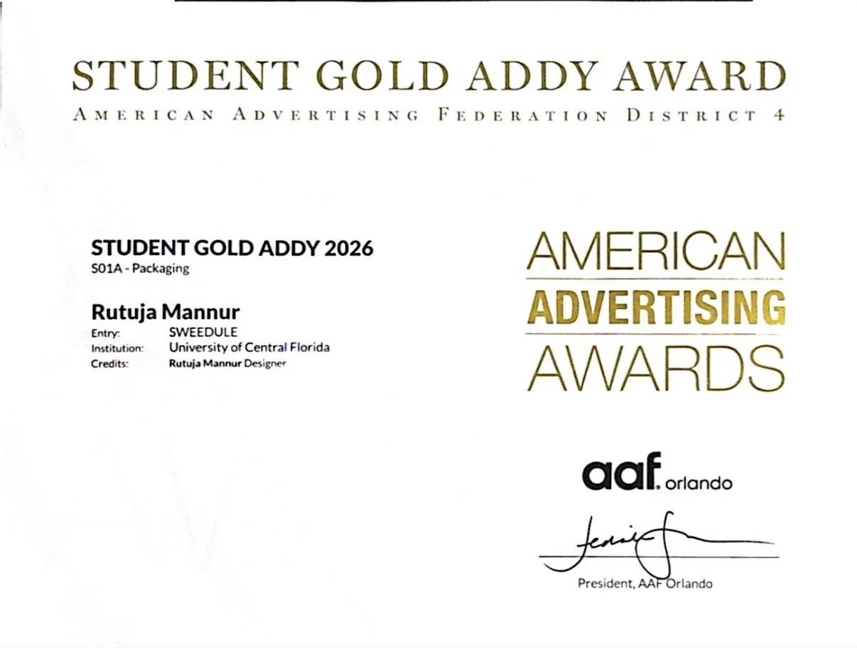 Gold Student ADDY Award by American Advertising Federation Orlando for design excellence.