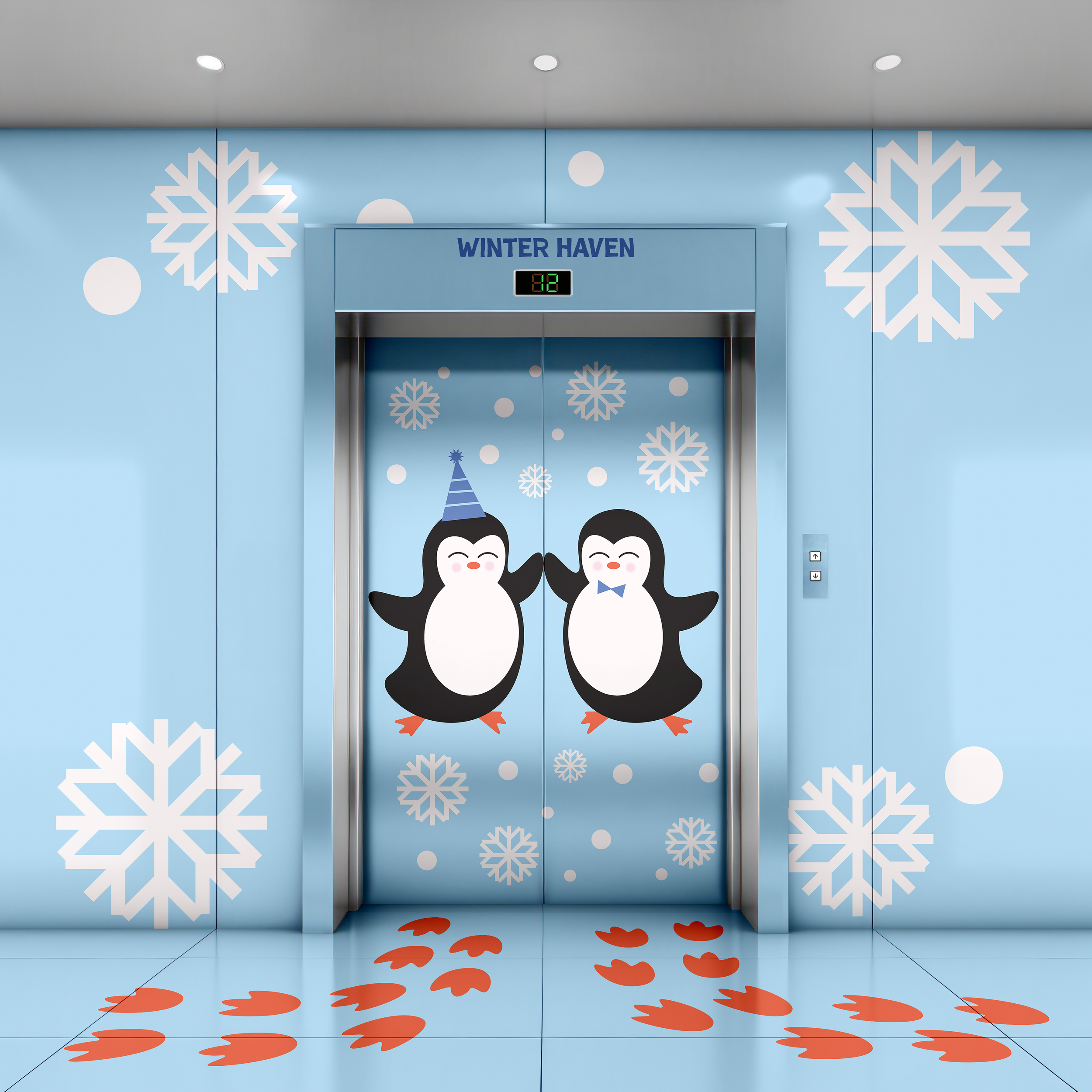 The goal was to transform a standard functional element, an elevator, into an immersive, narrative-driven portal. By utilizing the Winter Haven theme, the design masks the wait time with engaging visuals, encouraging children to follow the waddle tracks into a seasonal wonderland.
